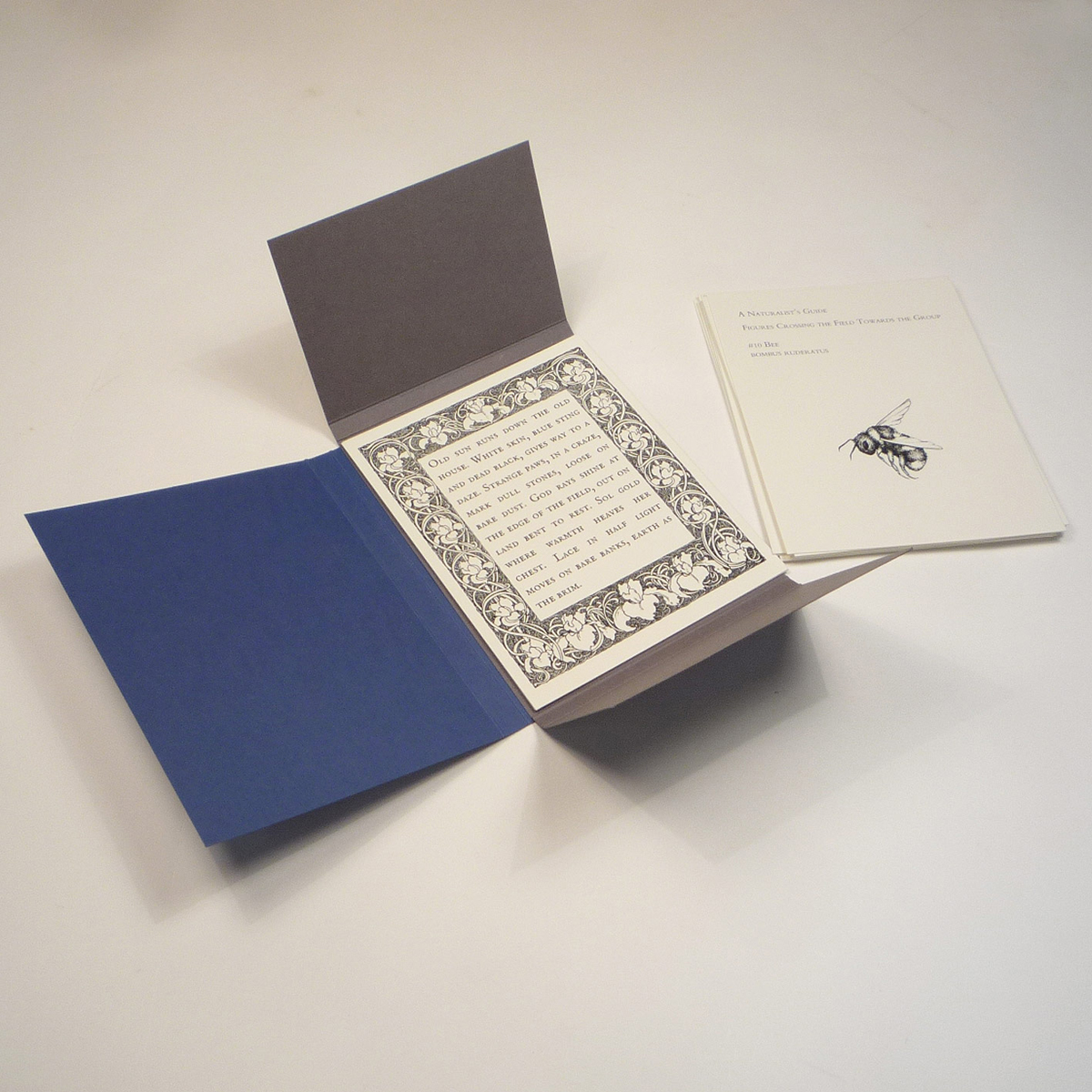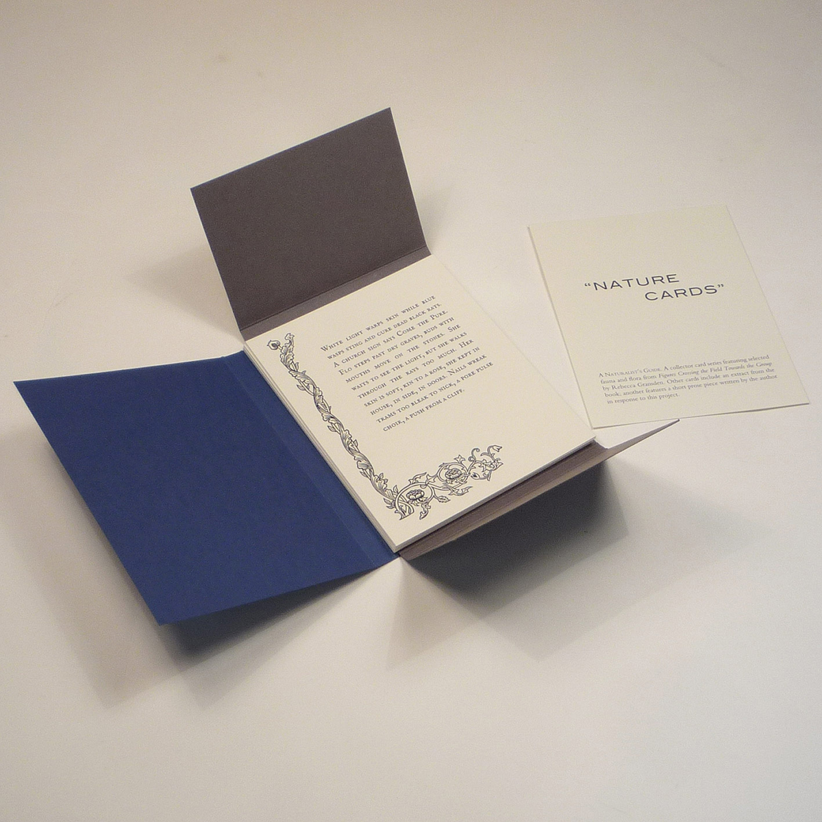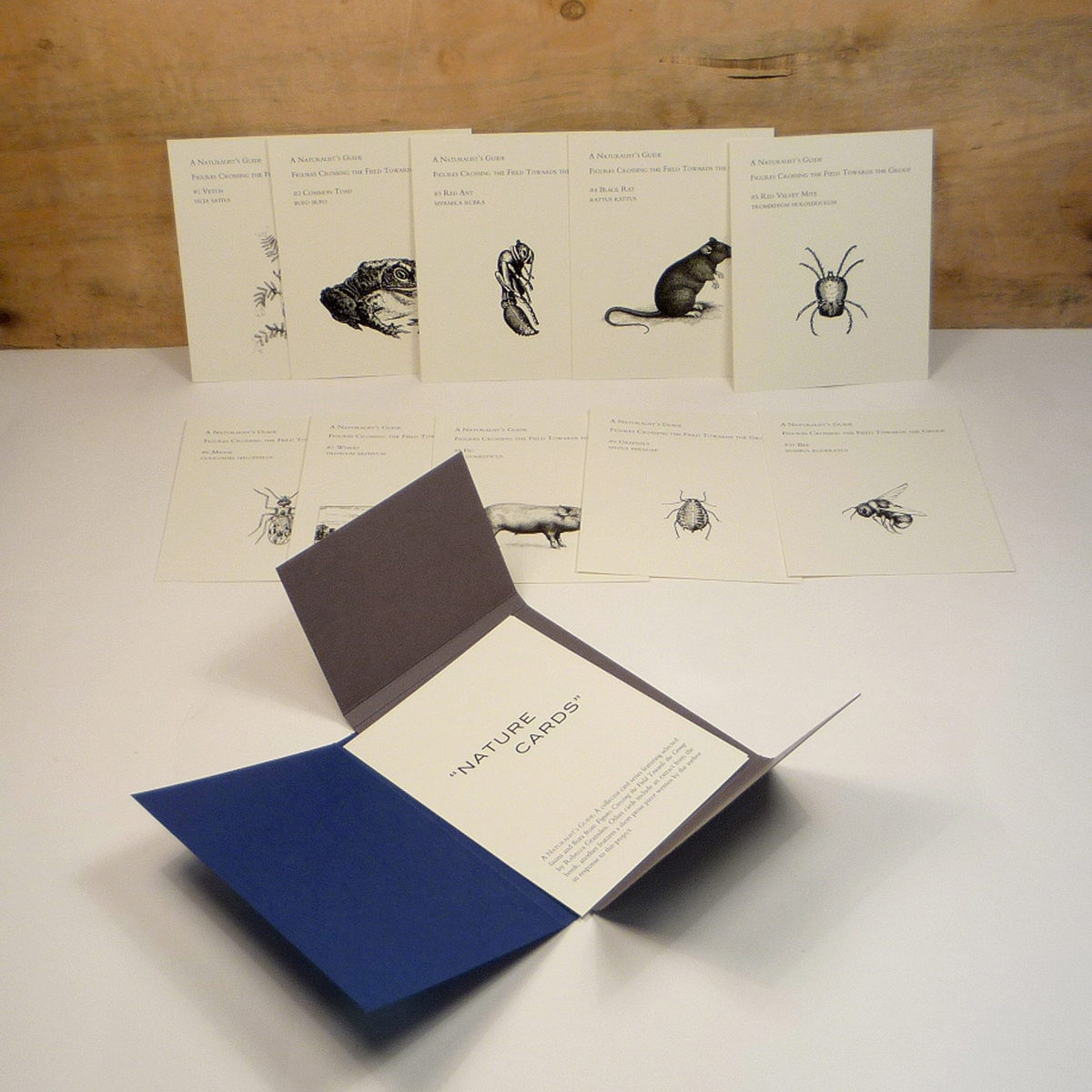 14 cards housed in a custom card mini-folder with inner wrapper and wraparound band: ten 'nature cards', plus title card, limitation, extract and new prose piece. Format, approx. 4”/100mm wide, 5”/125mm tall. Acid-free stock throughout; foil embossed front cover artwork and wraparound band.