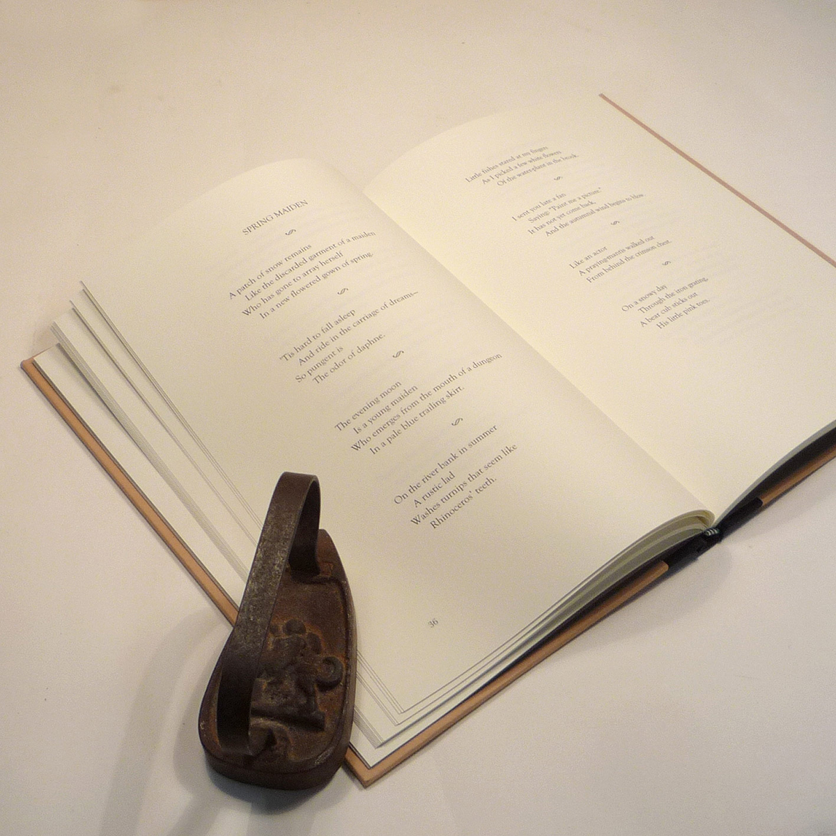 Quarterbound with Fabriano Tiziano 'oatmeal' paper covered boards and cloth spine; spine label paste down; acid-free text papers; Hahnemuhle Bugra Butten endpapers; front cover artwork embossed in black.