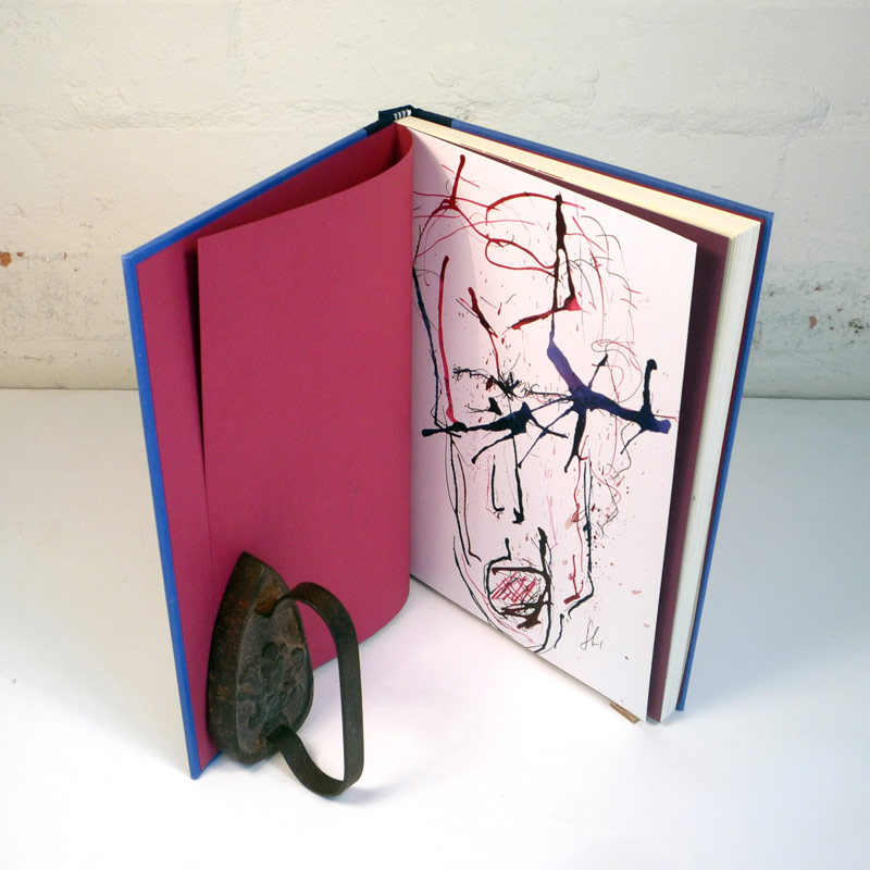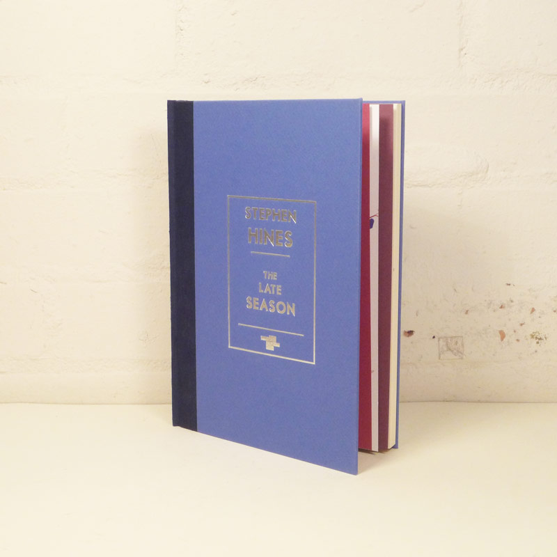 Quarter bound with Fabriano Tiziano marine blue paper covered boards and navy blue Japanese silk spine; front cover artwork embossed in silver; 100% recycled, acid-free text paper. An original, signed painting by Mr Hines on artist rag forms part of the 3-page ‘stepped’ Fabriano Tiziano front endpapers — the other page colours dark red and purple. Fabriano Tiziano dark red endpapers.